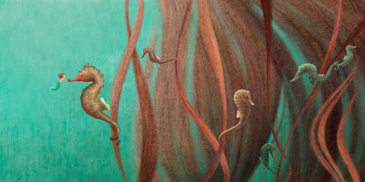 "She decided to search for her across the seas, but they were vast and the mermaid small, so she found a sea horse to take her faster and farther." How far will the mermaid dare to go to fulfill her greatest wish? Edizioni Theoria, Italy 2024